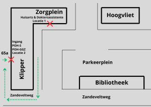 Locatie 1: De hoofdingang is op Zandeveltplein 57, hier kunt u terecht voor een afspraak bij de huisarts of doktersassistente.